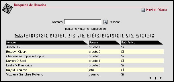 A través de esta transacción se realiza la búsqueda de usuarios del KIOSKO, presentando el nombre completo del usuario, la clave de usuario, y si esta activo como usuario.