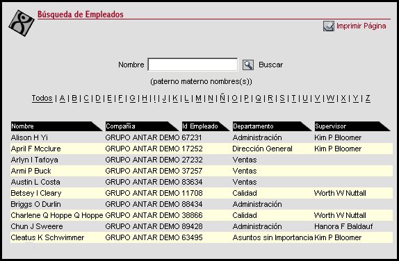 A través de esta transacción se realiza la búsqueda de empleados en el módulo. Esta transacción se presenta también en diversas transacciones de KIOSKO, para agilizar la búsqueda de empleados. La información de los empleados se obtiene del sistema Eslabón y sólo son mostrados los empleados activos de todas las empresas que se tengan configuradas.