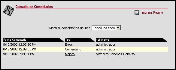 A través de esta transacción se realiza la consulta de comentarios que los usuarios del módulo hicieron referentes al KIOSKO. Estos comentarios se presentan como se requiera ya sean todos los tipos, error, mejora, comentario, o mercadotecnia, ordenados por fecha.