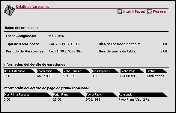 En esta transacción se presenta la información detalladamente de las vacaciones o prima vacacional del empleado.