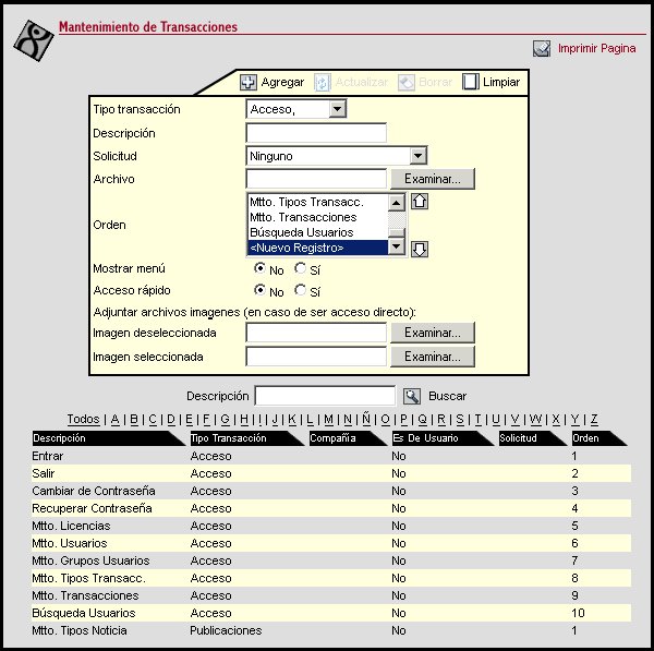 A través de esta transacción se realiza el mantenimiento de las transacciones que el usuario administrador requiera agregar en el módulo.
