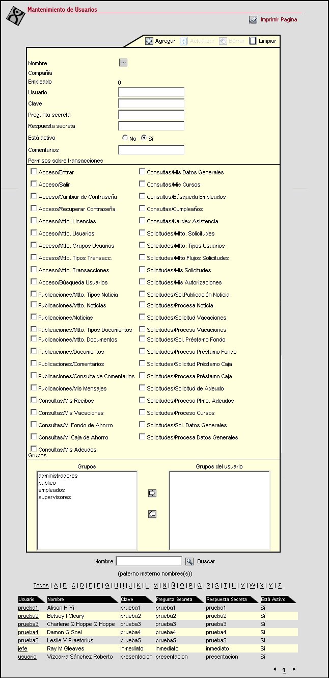 A través de esta transacción se realiza el mantenimiento de los usuarios (empleados de las diversas compañías que haya configurados en Eslabón) que accesarán el módulo KIOSCO, para que realicen los accesos a las diferentes transacciones configuradas. Como inicio, se les debe definir un perfil de usuario, ya sea como administrador o como un usuario final normal.