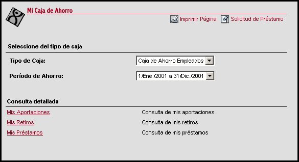 A través de esta transacción los usuarios pueden consultar la información respecto a la caja de ahorro. Otra de las actividades que permite realizar es solicitar unos préstamos por medio de una solicitud de la caja de ahorro.