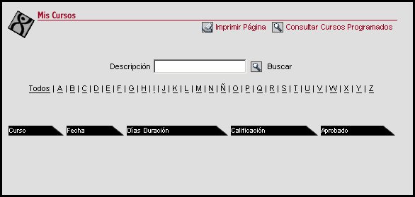 A través de esta transacción los usuarios del módulo realizan las consultas de los cursos a los cuales han asistido y los que tienen pendiente de asistir. En esta transacción se tiene la facilidad de que los usuarios consulten los cursos que se van a impartir en la empresa, para posteriormente poder solicitar un curso por medio de una solicitud.