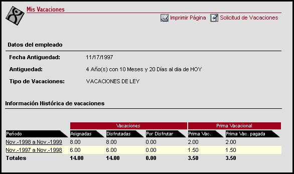 A través de ésta transacción los usuarios pueden consultar la información histórica de sus vacaciones, los días que le corresponden por cada período y los días que han sido distrutados, o que se encuentran pendientes por disfrutar. Asimismo esta transaccción especifica cuanto le corresponde de prima vacacional al empleado y si ya le fue pagada o no.