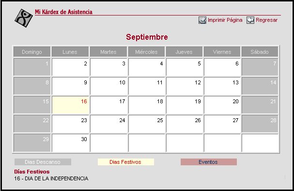 En esta transacción se presenta el mes y el año seleccionado especificando los días con un color, por ejemplo el gris significa que los usuarios no laboraran esos días, el amarillo que son los días festivos del mes, y el rojo los eventos que se van ha realizar en la empresa en el mes y año seleccionado.