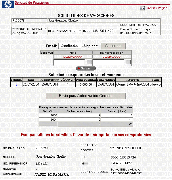Cerciorate de que cuando entres al WEB de nómina, aparezca la dirección de tu Email, ya que SI NO EXISTE, NO PODRAS SOLICITAR VACACIONES.
