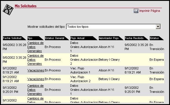 A través de esta transacción los usuarios realizan las consultas de todas las solicitudes que hayan realizado en el módulo (solicitud vacaciones, préstamo, curso, datos generales, caja de ahorro etc.). Puede consultar las solicitudes por tipo de solicitud o en su caso mostrar todas. Estos tipos de solicitud deben ser configurados desde la transacción Mantenimiento de Solicitudes. Si las solicitudes aún se encuentran sin autorizar, los usuarios aún pueden realizar modificaciones. Los diferentes estatus generales son: En proceso, Aceptada y Cancelada.